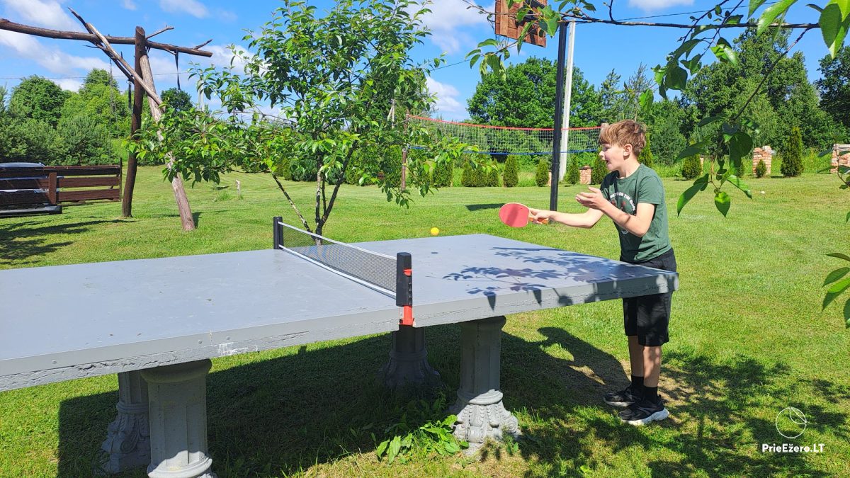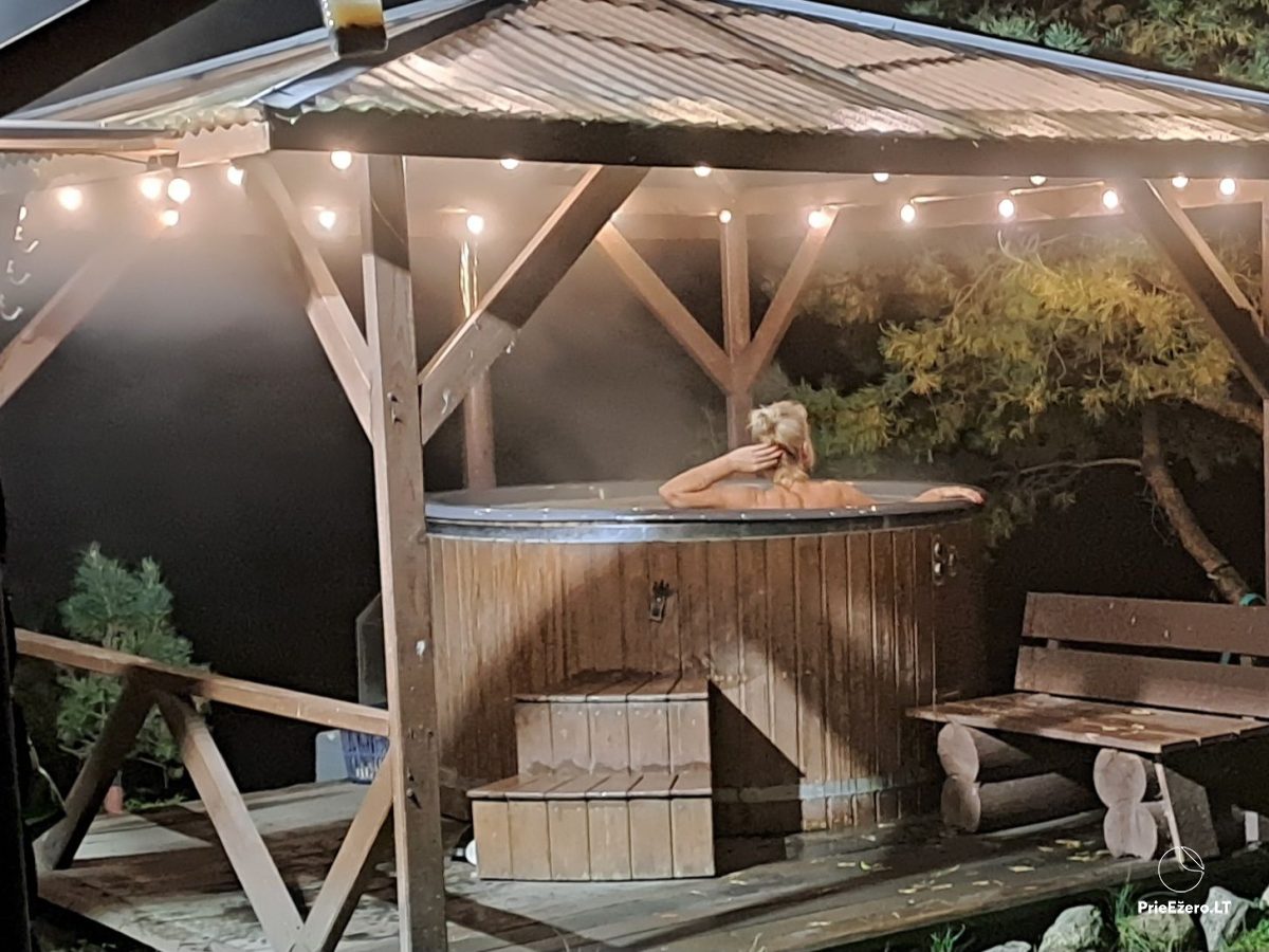There is an outdoor large hot tub, two gazebos, swings, basketball, trampoline, volleyball, darts, barbecue (skewers), cauldron, firewood, kayaks.