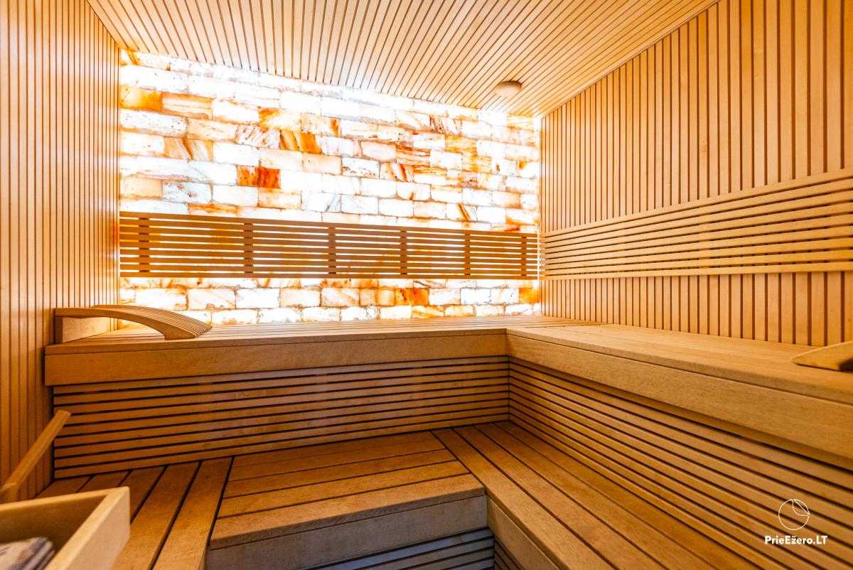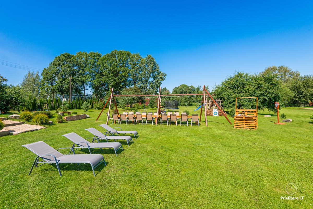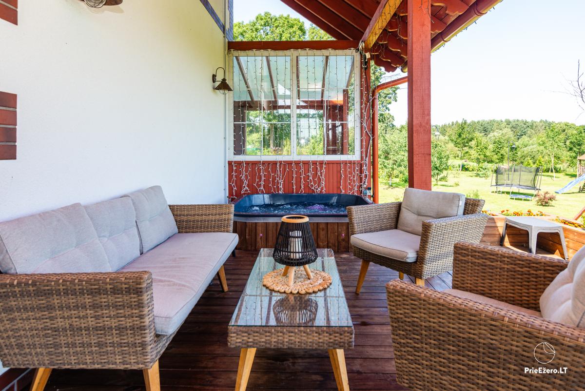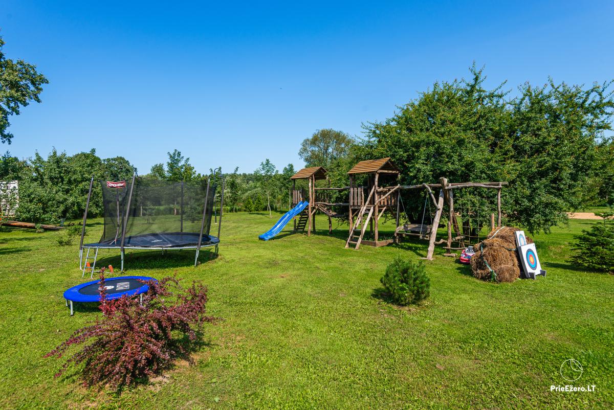 A large jacuzzi on the terrace under the roof with a view of river Minija, a Himalayan salt bath, a large trampoline and a playground for children.