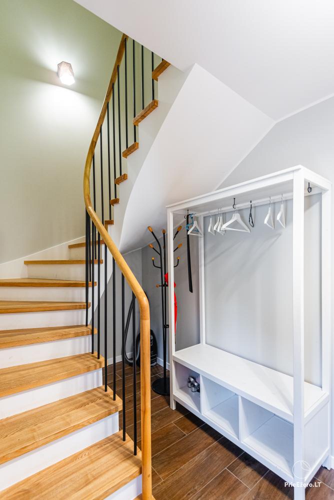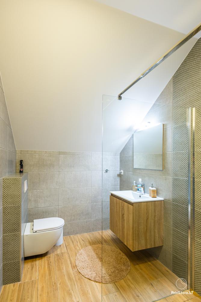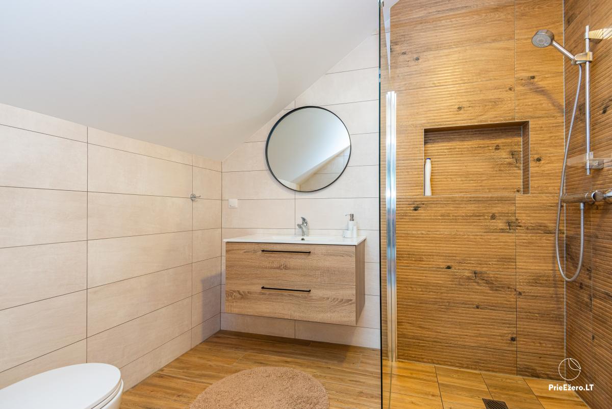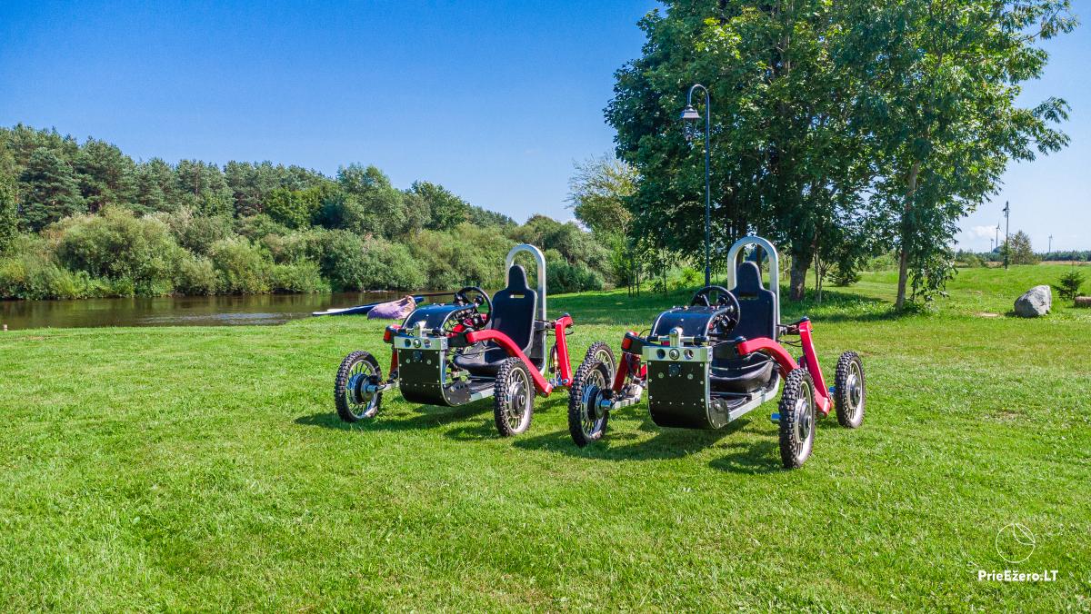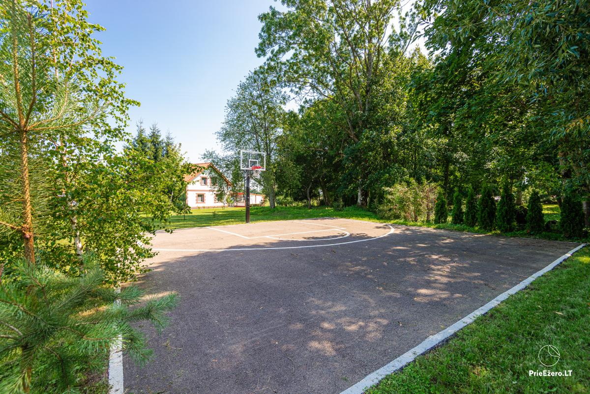 A large jacuzzi on the terrace under the roof with a view of river Minija, a Himalayan salt bath, a large trampoline and a playground for children.