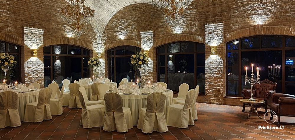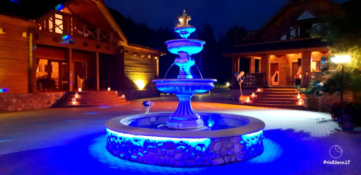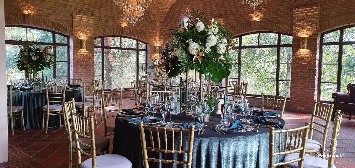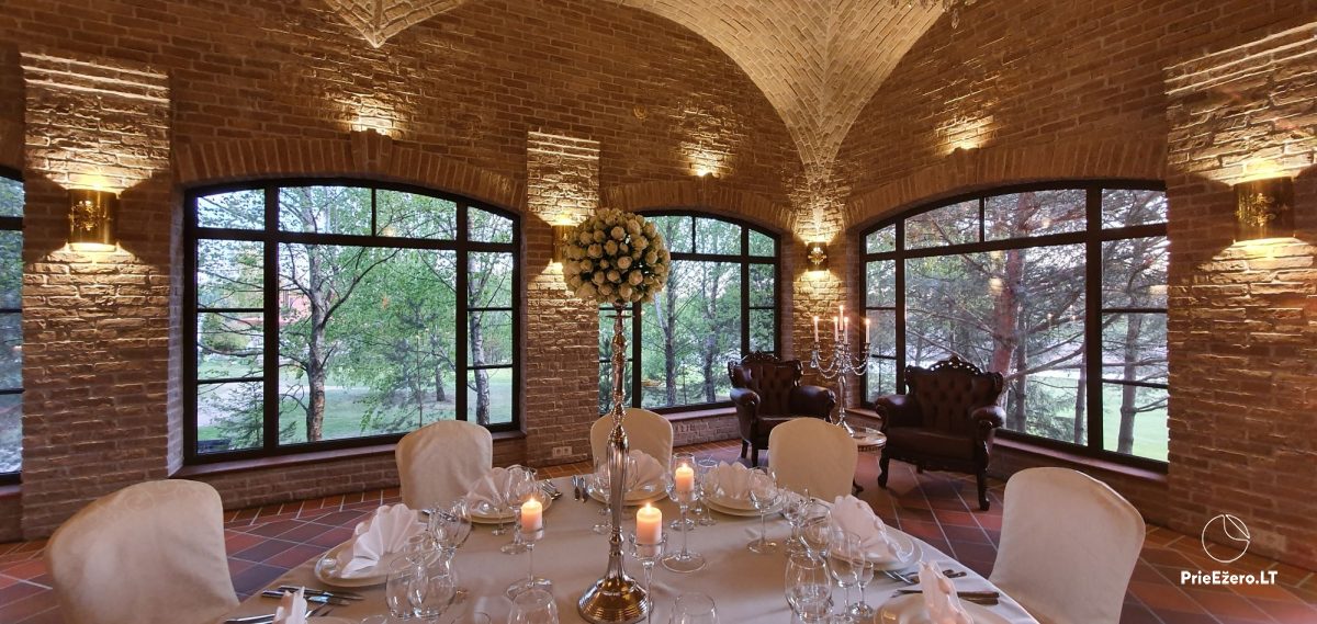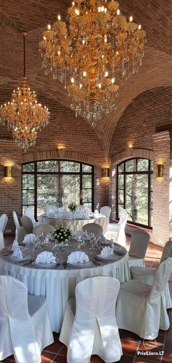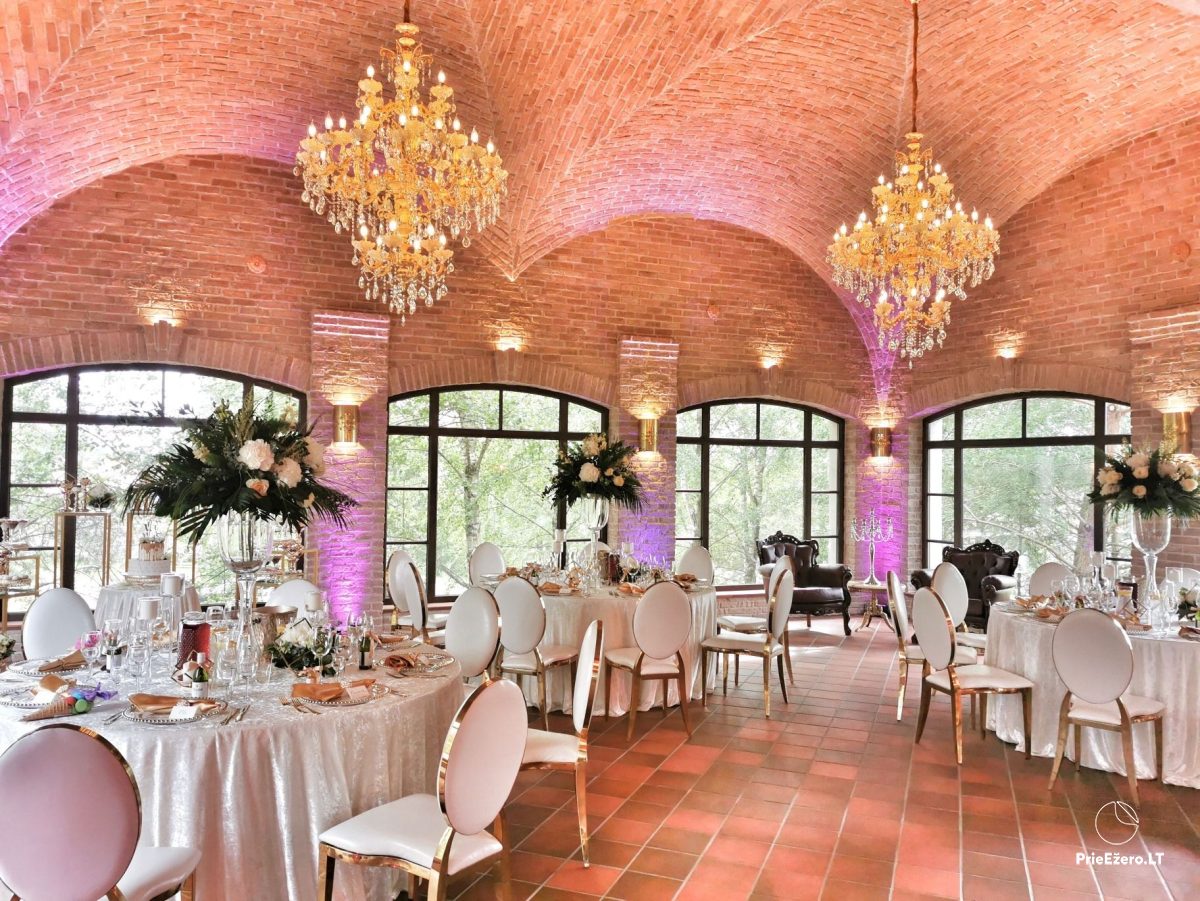 "Dvaro sodyba" offers a luxurious 70-seat banquet hall. We can additionally build a pavilion in the yard. There is a picturesque landscape and many entertainments: billiards, dance hall, sauna, Jacuzzi with tropical rain, terrace, fireplaces, degustations in a Gothic-style wine cellar, exclusive surroundings for photo sessions.