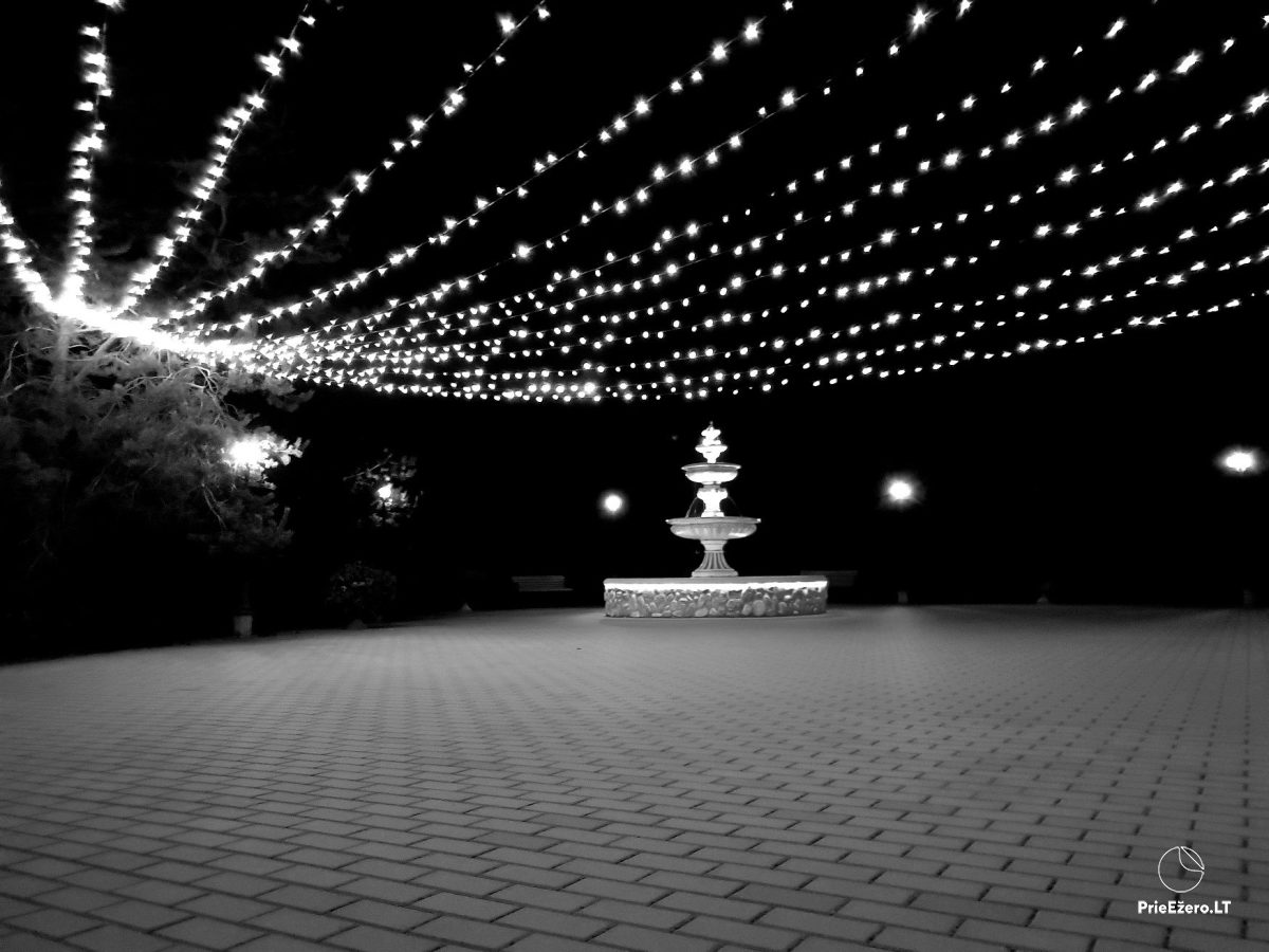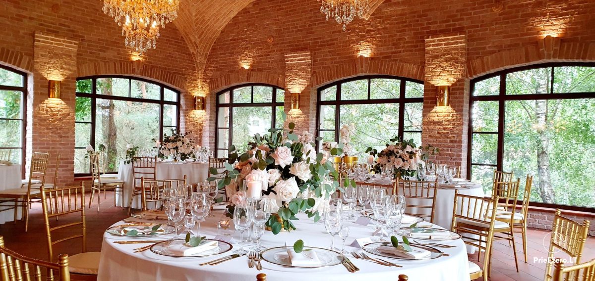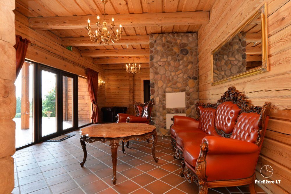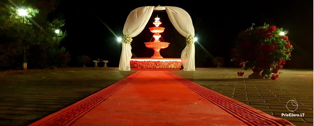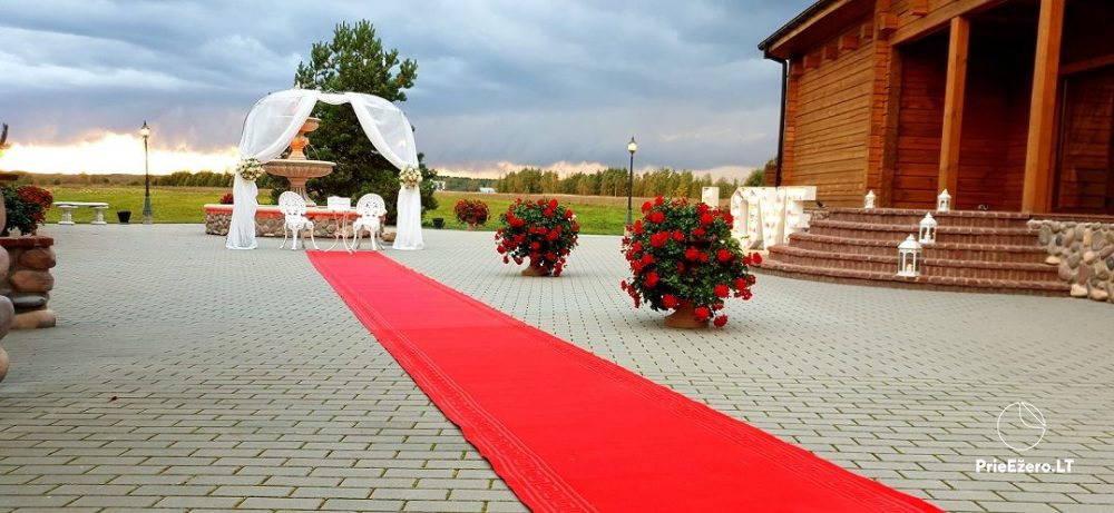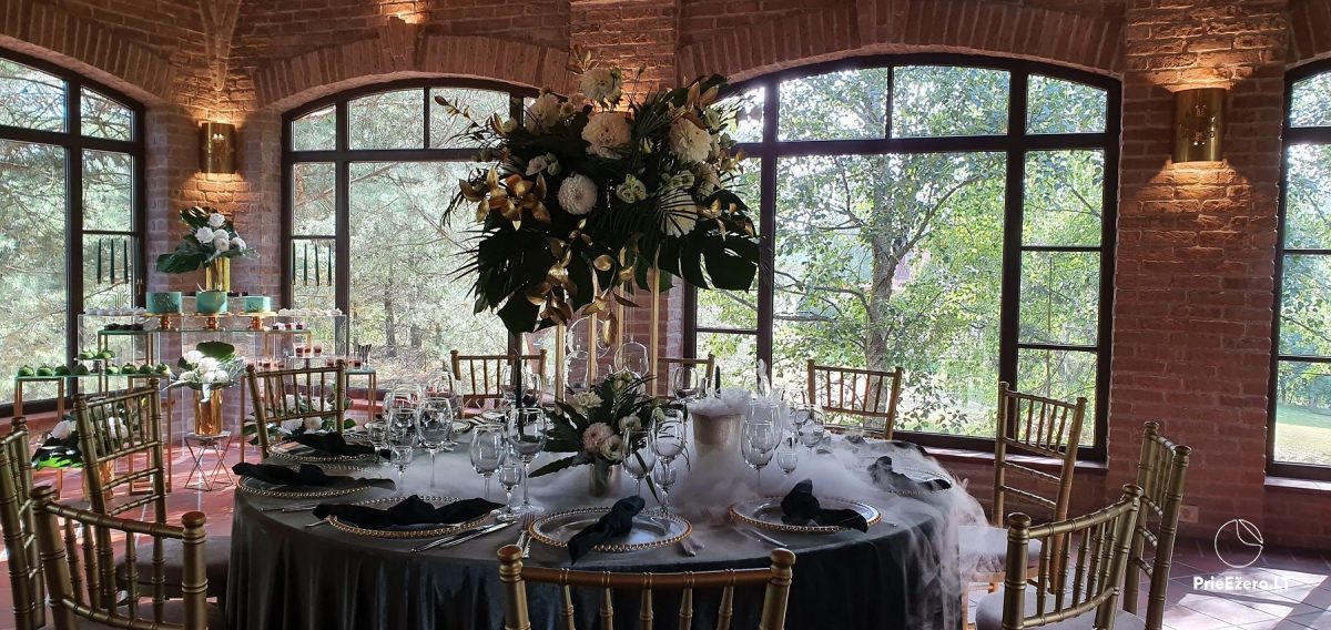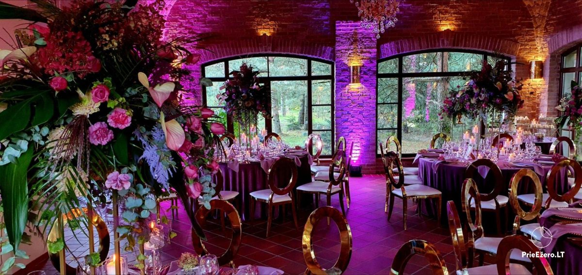 "Dvaro sodyba" offers a luxurious 70-seat banquet hall. We can additionally build a pavilion in the yard. There is a picturesque landscape and many entertainments: billiards, dance hall, sauna, Jacuzzi with tropical rain, terrace, fireplaces, degustations in a Gothic-style wine cellar, exclusive surroundings for photo sessions.