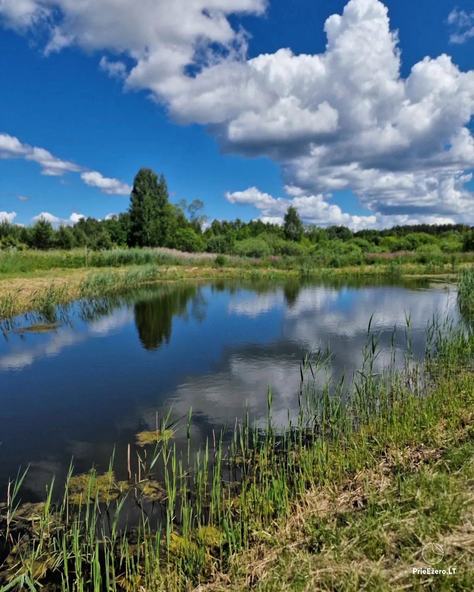 There is a pond on the homestead territory, and it is just 1 km on foot to a lake with a good shore.