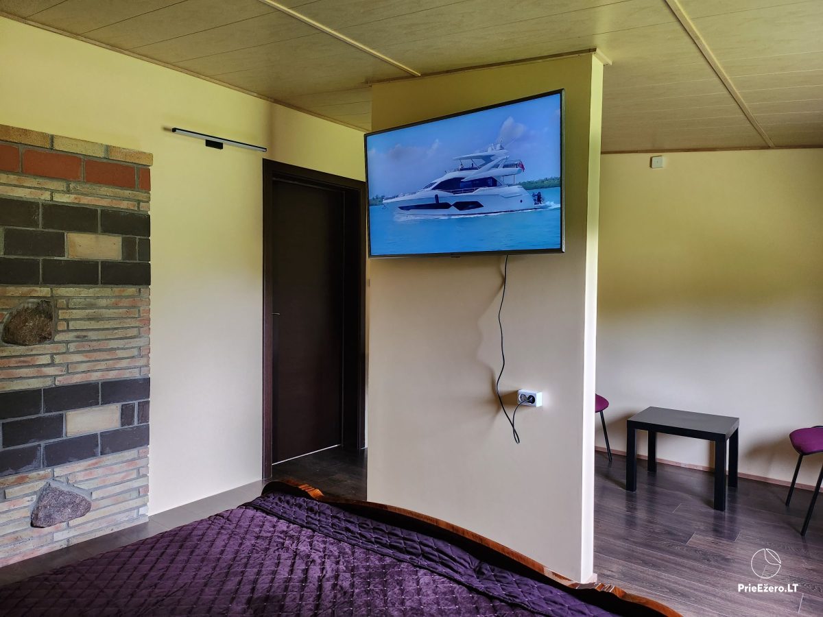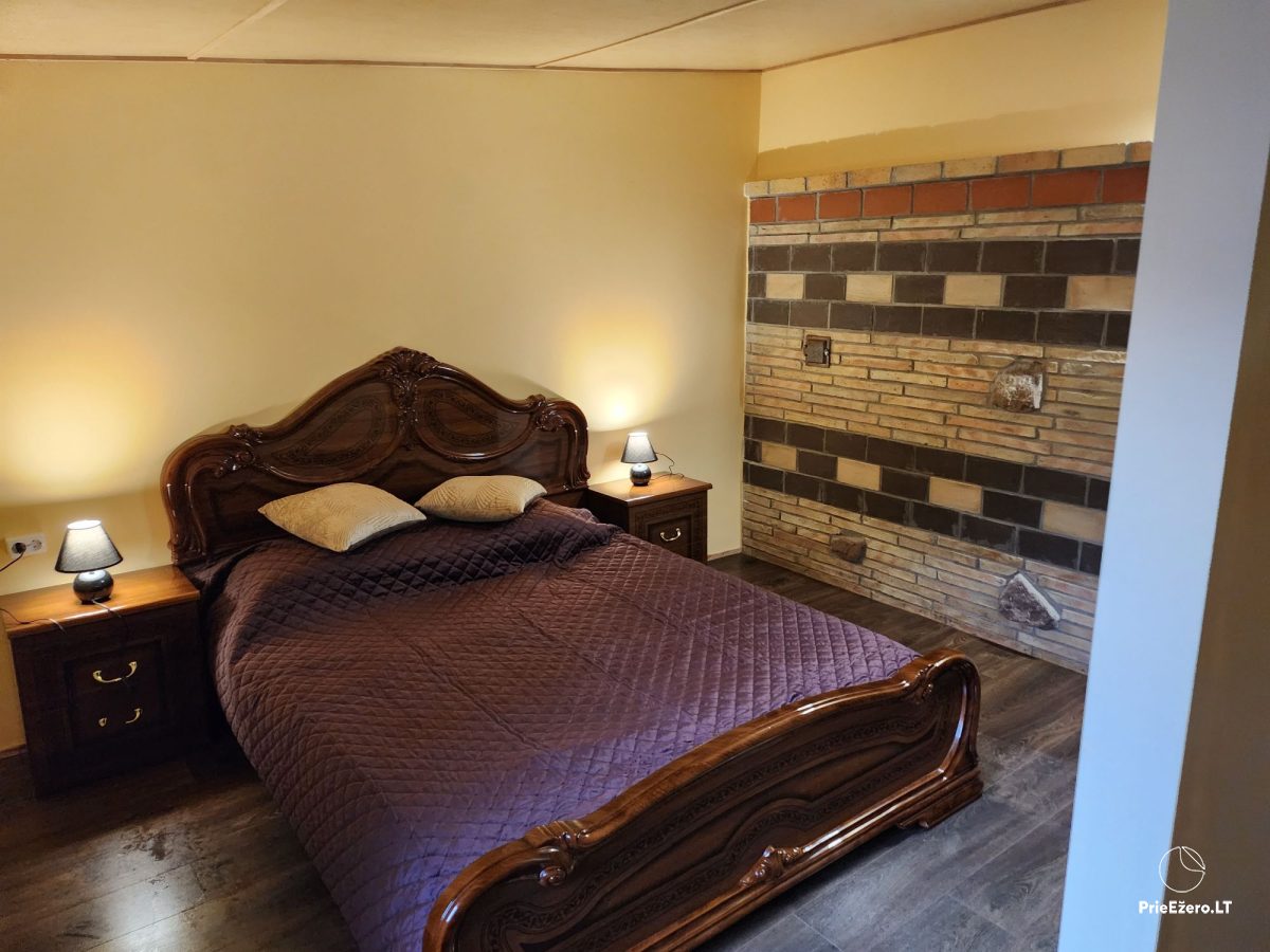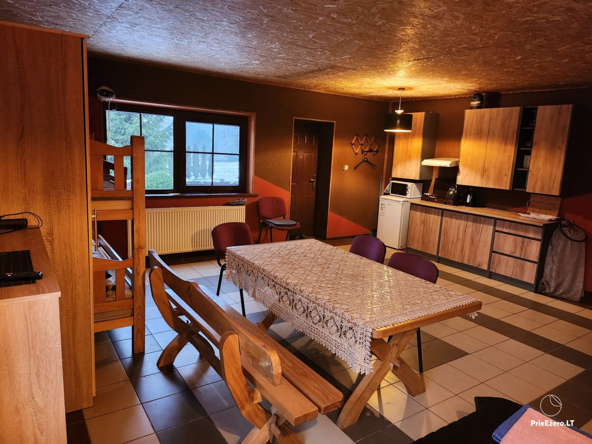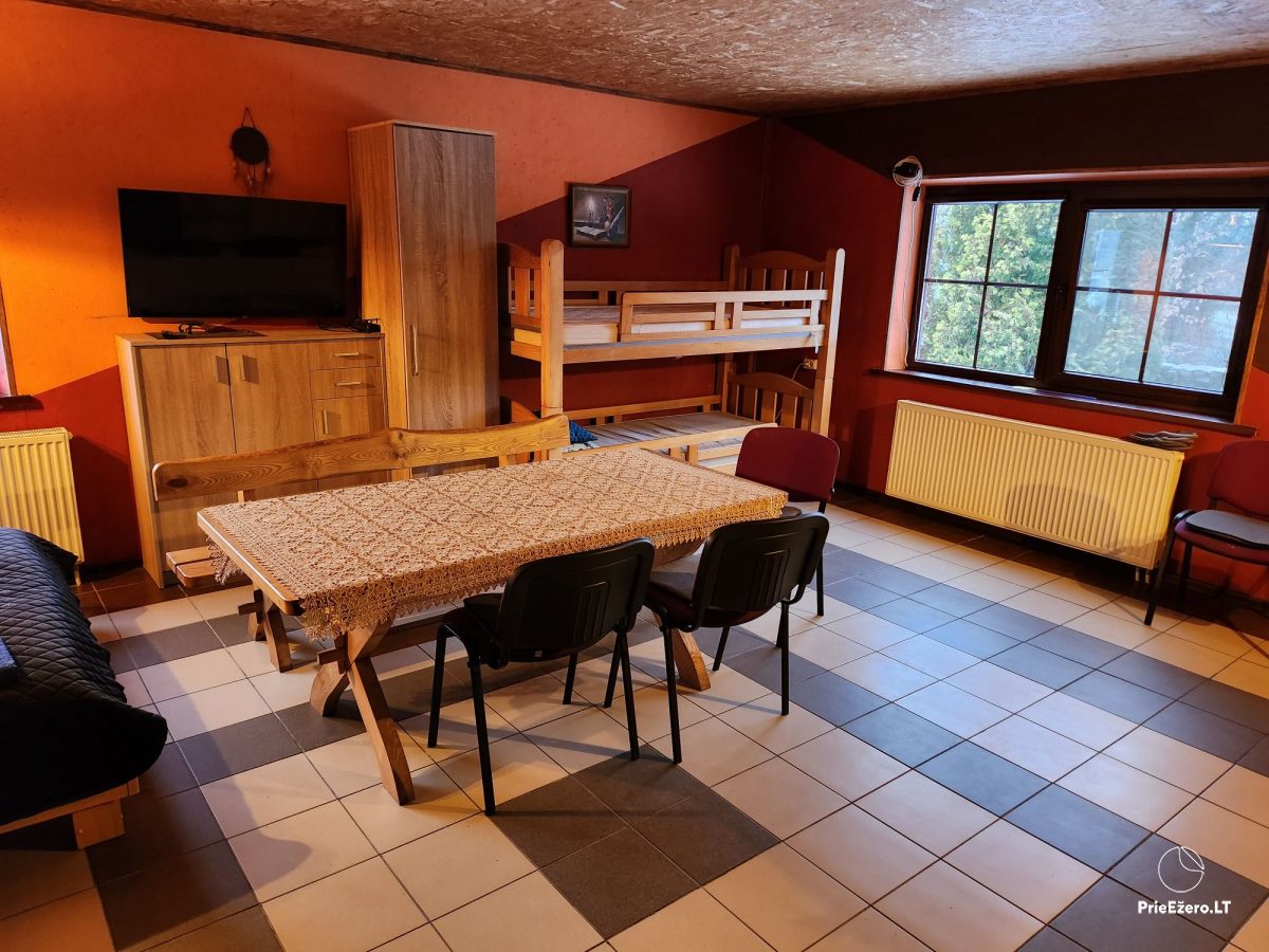 Ждем Вас в yсадьбe, которая расположена недалеко от Варены, рядом с лесом, в 60 км от центра Вильнюса. Усадьба предлагает отдых зимой и летом в двухместных, трехместных и четырехместных номерах. В номерах есть детская кроватка, маленькая кухня, микроволновая печь, a во дворе есть пруд, деревенские водные процедуры, батут, баскетбольная площадка. А с заходом солнца вы сможете сжечь свои заботы в огне алтаря. В доме с сауной могут разместиться еще 2-6 человека из той же компании, так как есть второй этаж с отдельным входом. В одной из комнат есть стол для настольного тенниса, где могут разместиться 2-4 человека, есть кухонный уголок, холодильник. Предлагаем парам передвижной дом, там есть мини-кухня и wc, и место для барбекю.